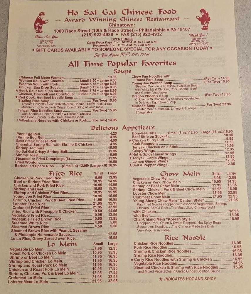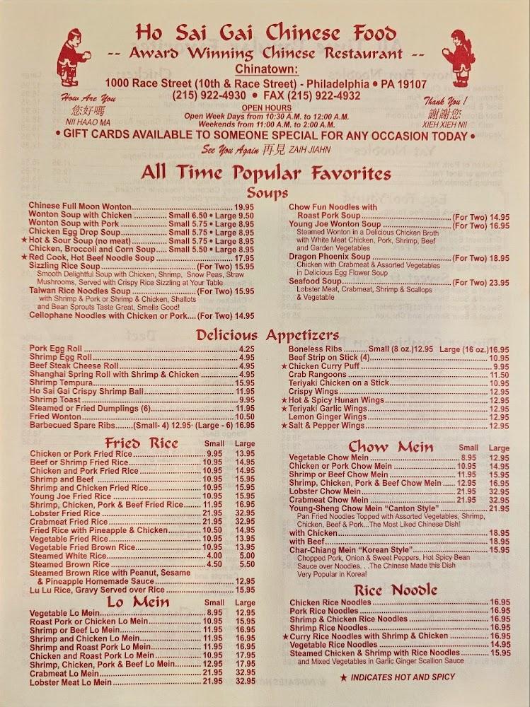 Discover the vibrant flavors of Ho Sai Gai Restaurant, located at 1000 Race St, Philadelphia. Specializing in Chinese and Taiwanese cuisine, our menu features a delightful array of dishes perfect for any occasion, whether you're stopping by for a quick lunch or enjoying a relaxed dinner. Enjoy our excellent cocktails and a wide selection of teas, all in a laid-back atmosphere that's ideal for groups, students, and tourists alike. With convenient services like delivery and takeout, alongside a vegetarian-friendly menu and late-night options, Ho Sai Gai offers something for everyone. Join us for a taste of home-style cooking in a pleasant setting!